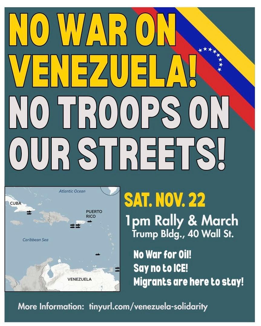 We join the national week of action with events in 50 cities to demand no war on Venezuela. The NYC action is: Saturday, Nov 22 1PM 40 Wall St.