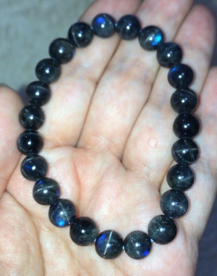 写真ではなかなか伝えられませんが、全珠にブルーのシラーとシルバーグレーのキャッツが浮かび上がる高品質キャッツアイブラックラブラドライトです。シックでクールなイメージです。