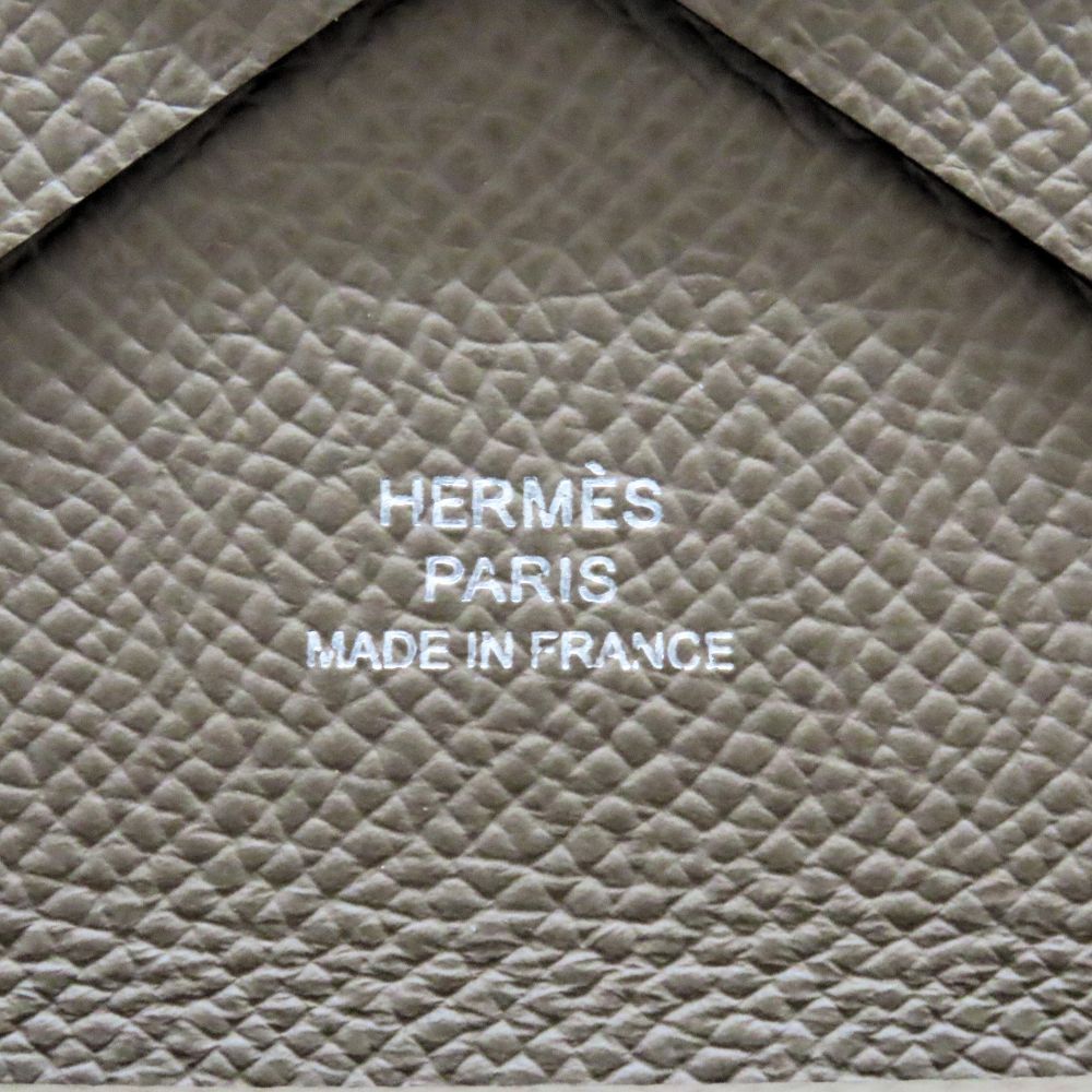エルメスの人気小物「カルヴィデュオ」。落ち着いたエトゥープカラーに丈夫で美しい型押しが特徴のエプソンレザーを使用した、上品で洗練されたデザインです。2つのポケットを備え、カードケースとしてはもちろん、小銭や折り畳んだ紙幣も収納可能。コンパクトながら高い実用性を誇り、ポケットや小さめバッグにも収まりやすいサイズ感です。エルメスならではの高級感と機能美を兼ね備えたアイテムです。