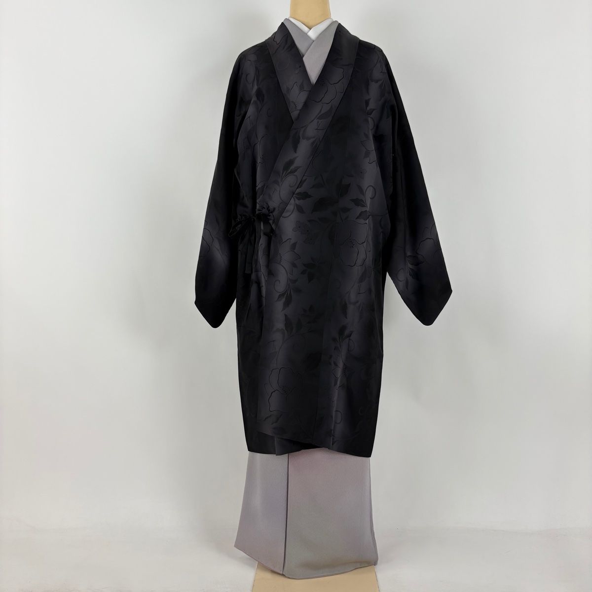 道中着 身丈106 cm 裄丈66 M 和装コート 着物衿 花唐草 縦ぼかし 黒灰 正絹