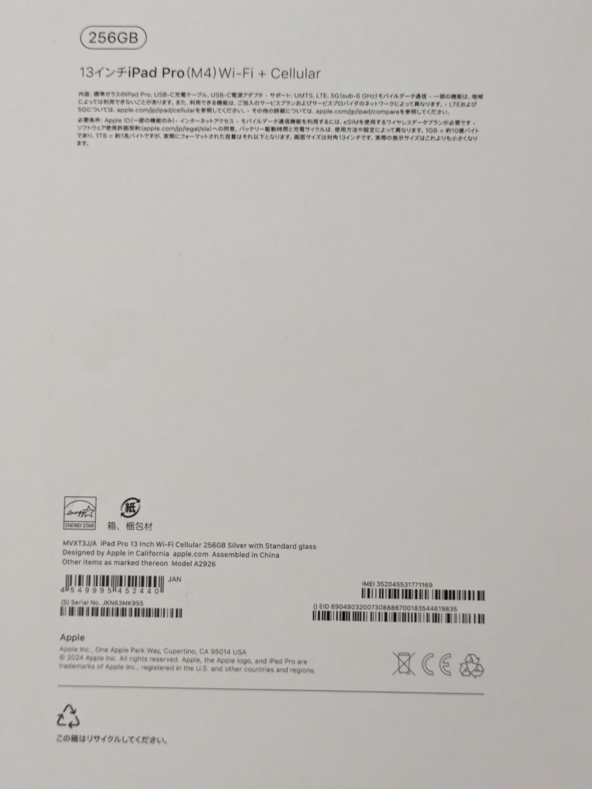 iPad Pro M 4 13インチ 256 GB Cellular 標準ガラス搭載 シルバー