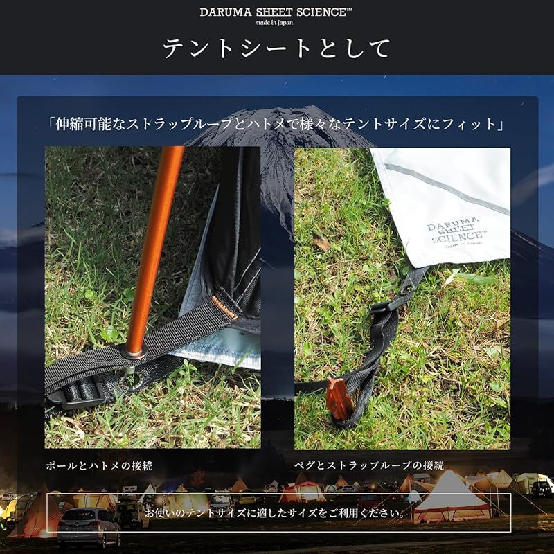 ?【こだわりのディテール】四方に配置されたベルトループは長さの調整が可能。先端がループ状になっているので様々なテントサイズのグランドシート として柔軟にフィットします。また、ハトメも付いているのでポール接続も可能です。また、水洗い後に乾かす際に便利な中央に配置されたループベルトは様々なシーンで役立ちます。