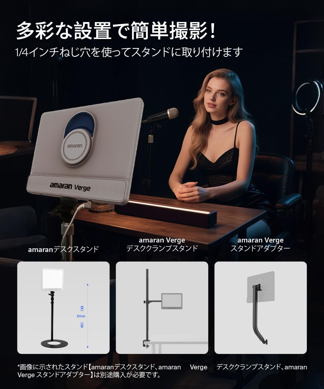柔軟な設置オプション: デスクスタンド(別売)、クランプ、ライトスタンドアダプターに対応。背面の1/4-20インチマウントで三脚にも取り付け可能。