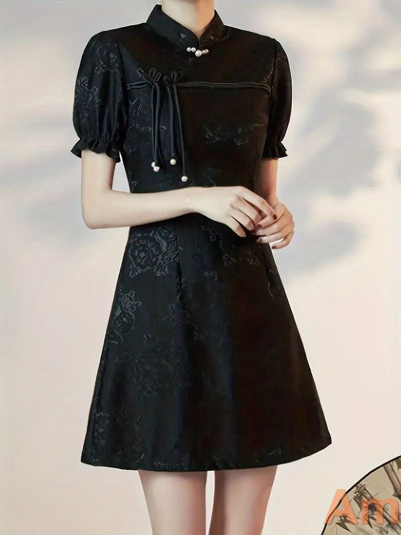 チャイナドレス ミニ チャイナドレス風 ワンピース コスプレ 衣装 チャイナ服 ブラック パフスリーブ フ スカート パーティードレス 結婚式 0781 min