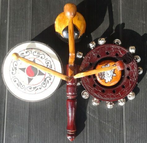 木製の持ち手に3種類の打楽器が取り付けられたおもしろいリズム楽器です。