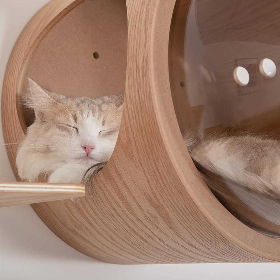 宇宙船 猫ハウス ペット用ベッド ドーム状 壁付け対応 床置き対応 透明宇宙船 ウォールナット 右開き 高質素材 猫用ベッド 据え置き 壁付け 寝床 木製 オシャレ
