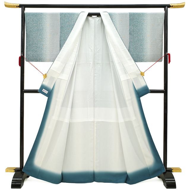 アクアマリンからライトグレーへと移りゆく美しいグラデーションの地色に、個性的な変わり格子柄が染め上げられた、上品でモダンなデザインです。