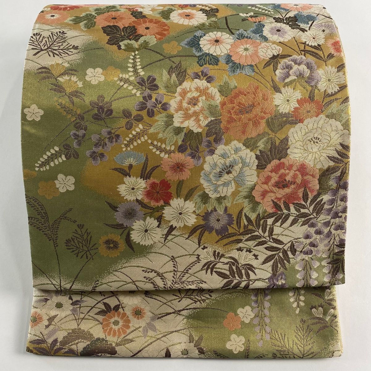 袋帯 秀品 扇面 草花 箔 薄緑 六通 正絹