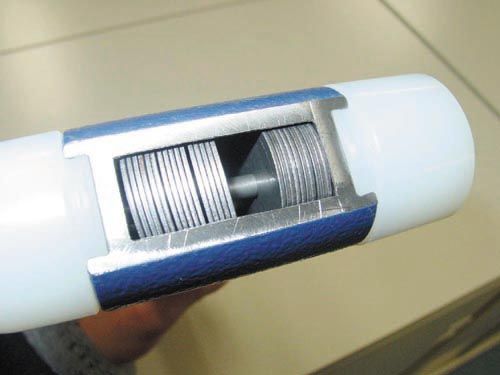 ●内部にディスクが内蔵されたヘッドは、インパクトの瞬間にディスクが打撃面方向へ移動することで反動を打ち消し、打撃力だけを伝えます。