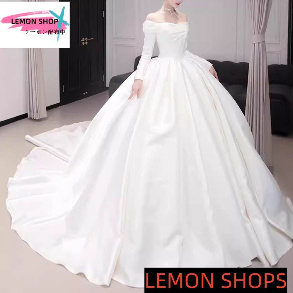 ♥ 2025 ウェディングドレス ロングドレス 結婚式 ウエディングドレス 長袖 Aラインドレス 二次会 花嫁 前撮り エレガント オフショルダー サテン ホワイト シンプル ロングトレーン 披露宴 LEMON