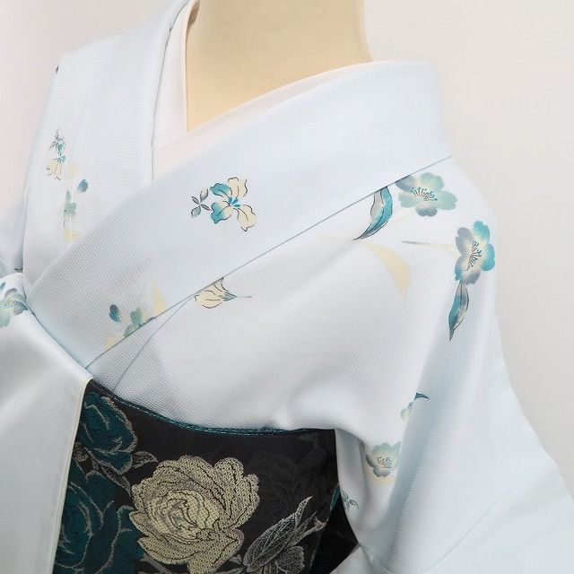 お着物は、水色地に青みを帯びた花柄が浮かぶ一枚。爽やかさの中に華やぎを感じさせます。そこに、黒地に薔薇をあしらった西陣織の袋帯を合わせることで、着姿をきりりと引き締め、エレガントな印象を演出。
