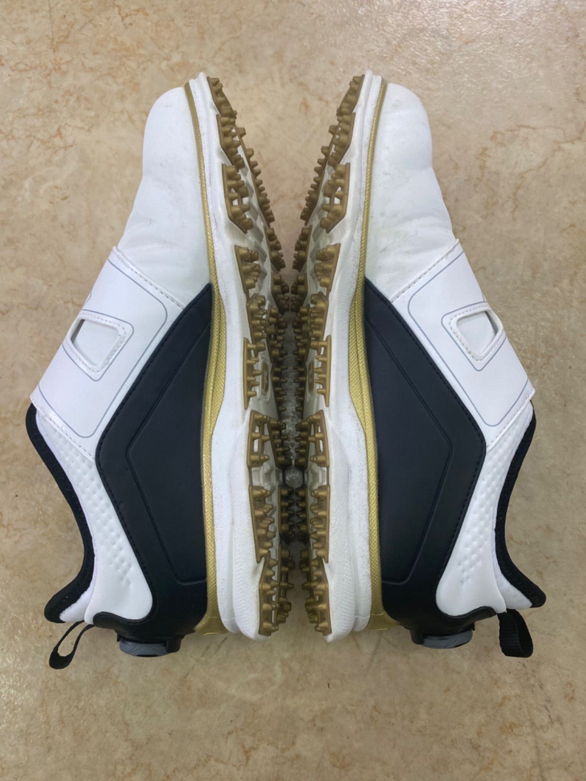 ホワイトを基調としたデザインにブラックとゴールドのアクセントが映えるスタイリッシュな一足です。