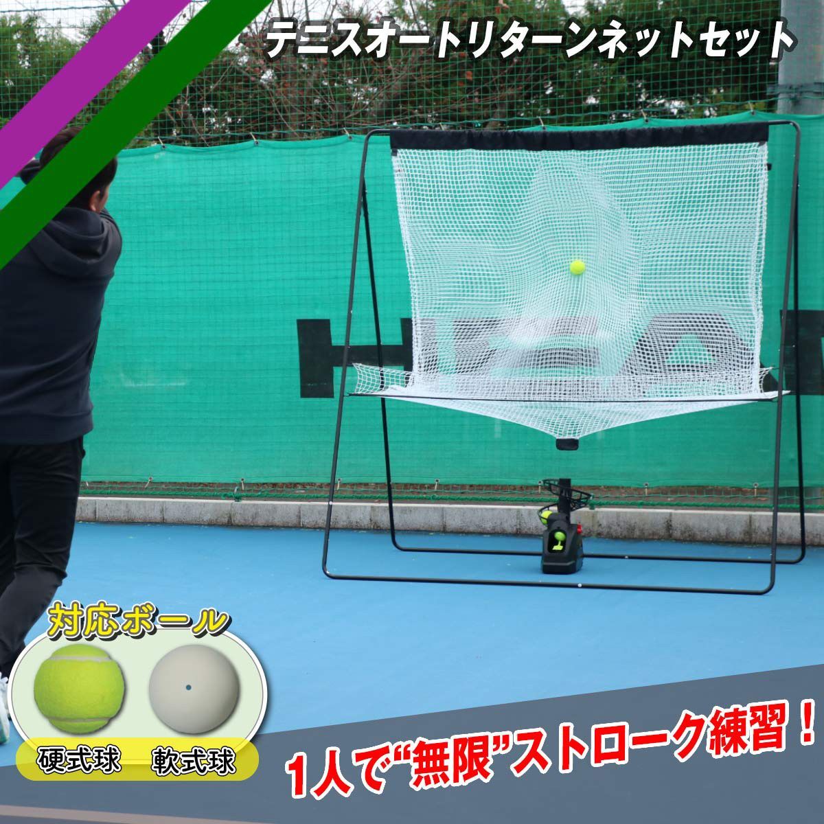 ◇ネット中央部に打ち込めれば、マシンにボールが自動供給され、半永久的にストローク練習ができます