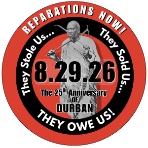 25 years ago, we saw the first product of those lessons learned when the UN World Conference Against Racism (held in Durban, South Africa) adopted the Durban Declaration and Program of Action [DDPA]. The DDPA was the first international declaration that the Trans-Atlantic Slave Trade and Slavery were Crimes Against Humanity and that Reparations are due to the descendants of the victims of these crimes. This historic victory was achieved through a campaign waged by Black NGOs (Non-Governmental, i.e. Community, Organizations) from around the world who worked closely with the African and Caribbean countries in the U.N. to push through this consensus document. Every country in the world joined in the DDPA, except the U.S. and Israel who walked out of the Conference instead of acknowledging our right to reparations. They’ve since set out to erase and distort the DDPA and have delayed the progress of its implementation.