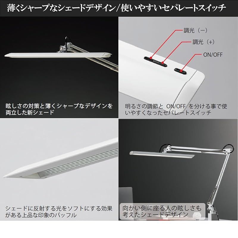 さらに目に優しく理想の光になるように光源のレイアウトを工夫したデスクライト。より眩しさへ配慮しながらもこれまでのシェードの薄さと手元の明るさに妥協せず空間に溶け込むシャープなデザインと幅広い作業に最適な明るさを実現しています。