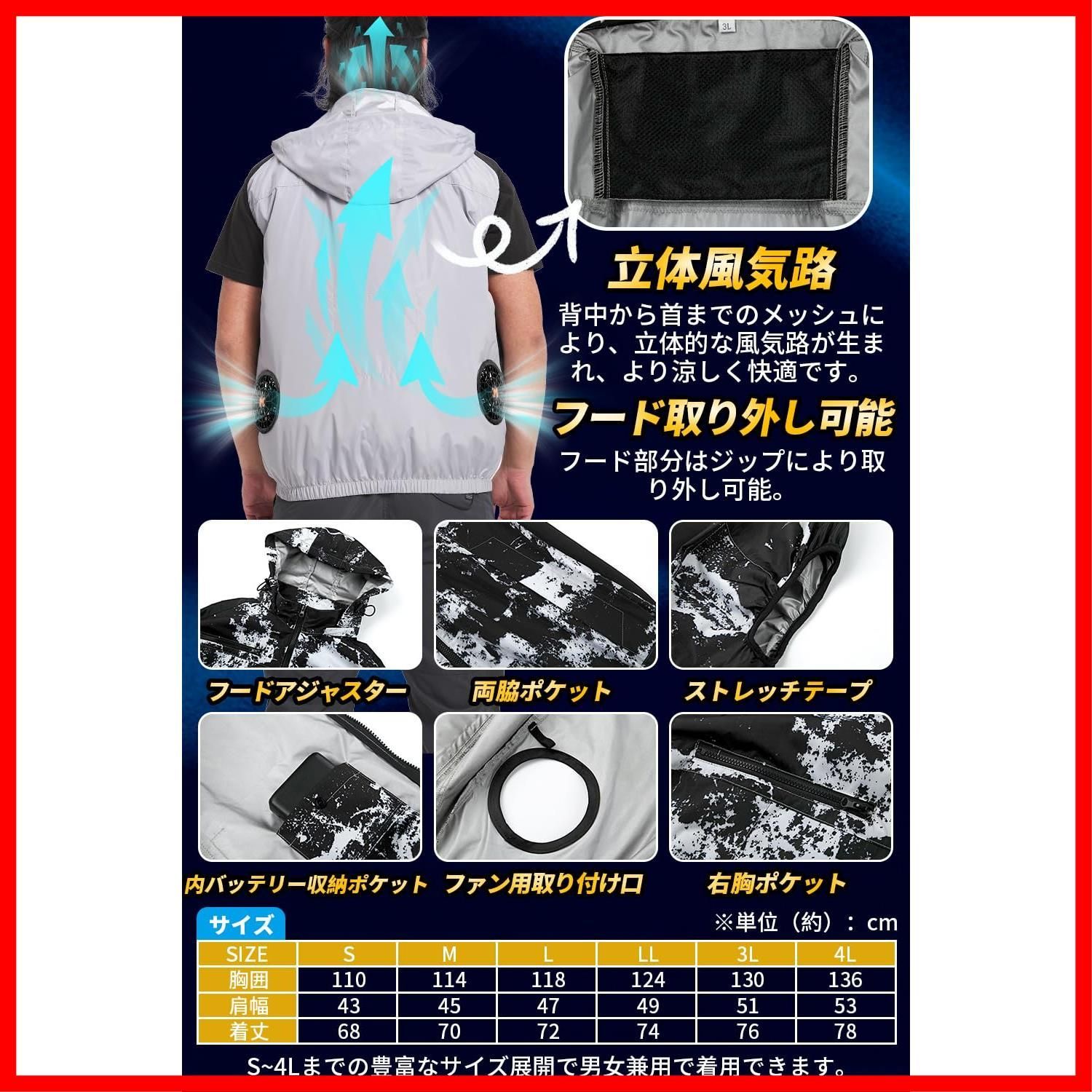【お得なフルセット&気軽に使えるオシャレな熱中症対策!&こだわり抜いた品質】届いたらすぐに使える!ウェア、バッテリー、ファン、専用充電器すべてが揃ったフード付きベストタイプ空調作業服が登場!素材は、軽量でホームケアも簡単なポリエステル100%を使用しております。裏側に紫外線・赤外線をカットし高い遮熱効果のあるアルミコーティングが施されているので、衣服内の温度上昇を抑える効果があり、圧倒的な涼しさを実現します!強度も強くアウトドアやハードワークにもご使用頂けます。通常の素材のファン付き作業服と比較して、平均で温度を10℃低下させる効果があります。首の後ろが立体構造となっており、通気性に優れているため、暑い中でも涼しく過ごせます。また保冷剤を入れられるメッシュポケットが付いているため、併用する事で高い冷却効果があり首元を抜ける空気がさらに涼しく感じます。