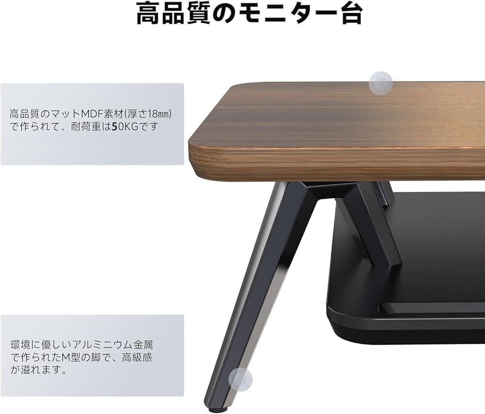 【安心安全な材質 ・優れた安定性】:環境に優しいMDFから作られたパソコン台は耐久性に優れ、M型のアルミニウム脚は高級が溢れながら、天板をしっかりと支えています。机上台の最大の耐荷重はなんと50kgで27インチのモニターを2台を置いても安定しています。
