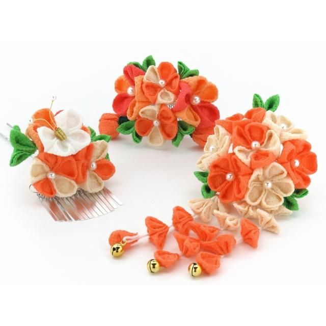 こども髪飾り’鈴音屋’手作り-ちりめん髪飾り オレンジ摘み藤に白の蝶 銀ビラ付き 3点セットSZN 741