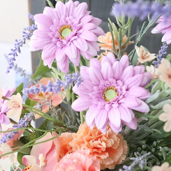 上品なラベンダー色のガーベラに、ピーチカラーのカーネーション、柔らかに咲く胡蝶蘭など、
