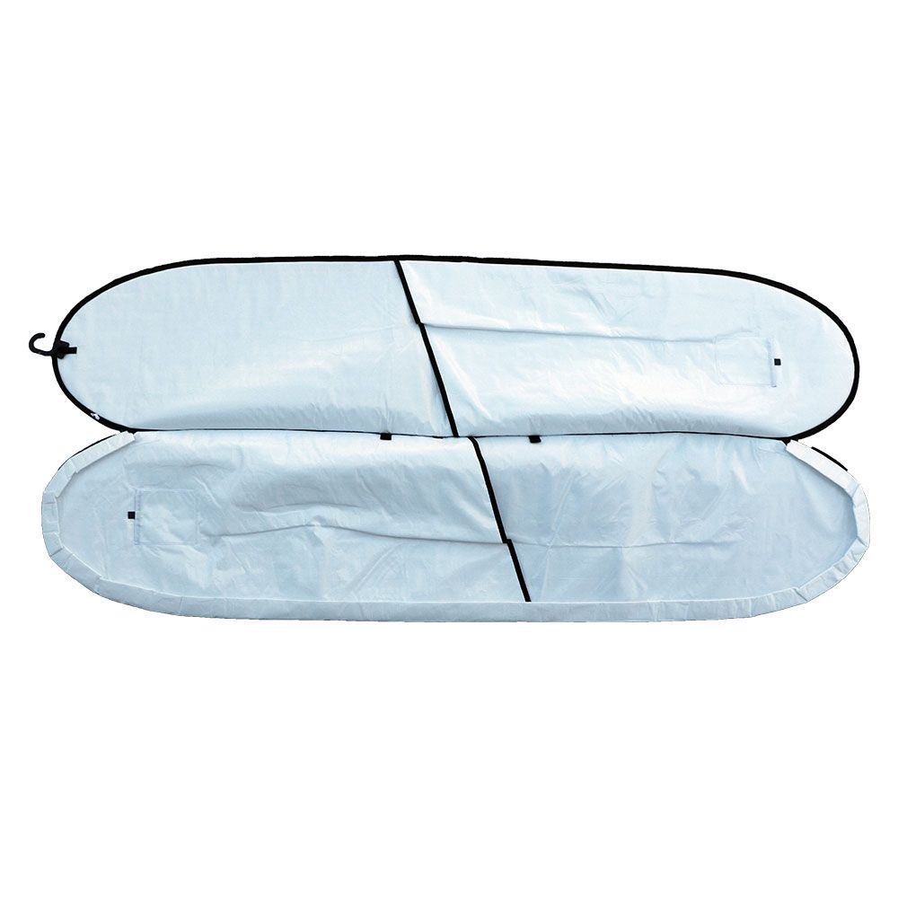 互い違いにボードを差込む2本用バッグ。 US AIR TRAVALは従来のプロテクションパッドよりも強度、軽さを追求しました。 より軽快で安心なサーフトリップをお約束します。 耐摩耗性に優れた『RIPSTOP800 デニール』ナイロンを使用 高強度の800デニールナイロンに、裂け防止のための格子状のリップストップ織りを施した生地を採用。摩耗や引き裂きに強く、アウトドアやハードユースに適した耐久性の高い素材です。 腐食せず、頑丈な『PKマリングレードジッパー』を採用 海水や湿気による腐食に強い、耐候性に優れたPK製のマリングレードジッパーを使用。プラスチックながら高い強度を持ち、長期間の使用でもスムーズな開閉を保ちます。 内側は手入れが簡単な『ホワイトPE素材』 耐水性・耐薬品性に優れ、濡れた物や汚れ物の収納にも適しており、使用後も簡単に拭き取って清潔を保てます。 2本収納可能 サイズ 9'6″:303×75 5.6kg