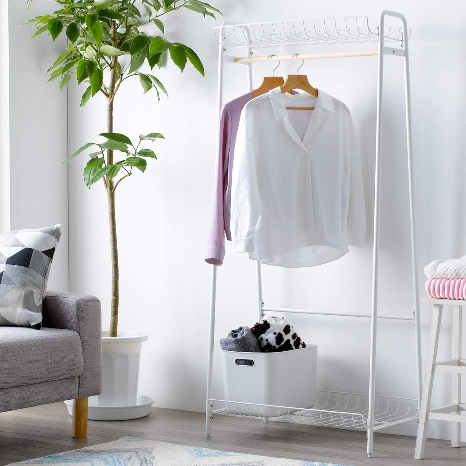 5~7着程度が収納できるハンガー部と、バッグや帽子などが収納できる棚付きで実用性も抜群。