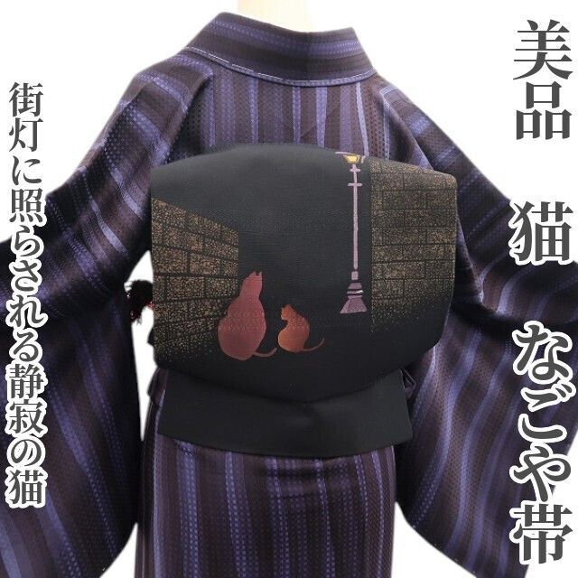 ❁tomihisa❁ 猫 着物 正絹 街灯に照らされる静寂の猫 なごや帯 7044