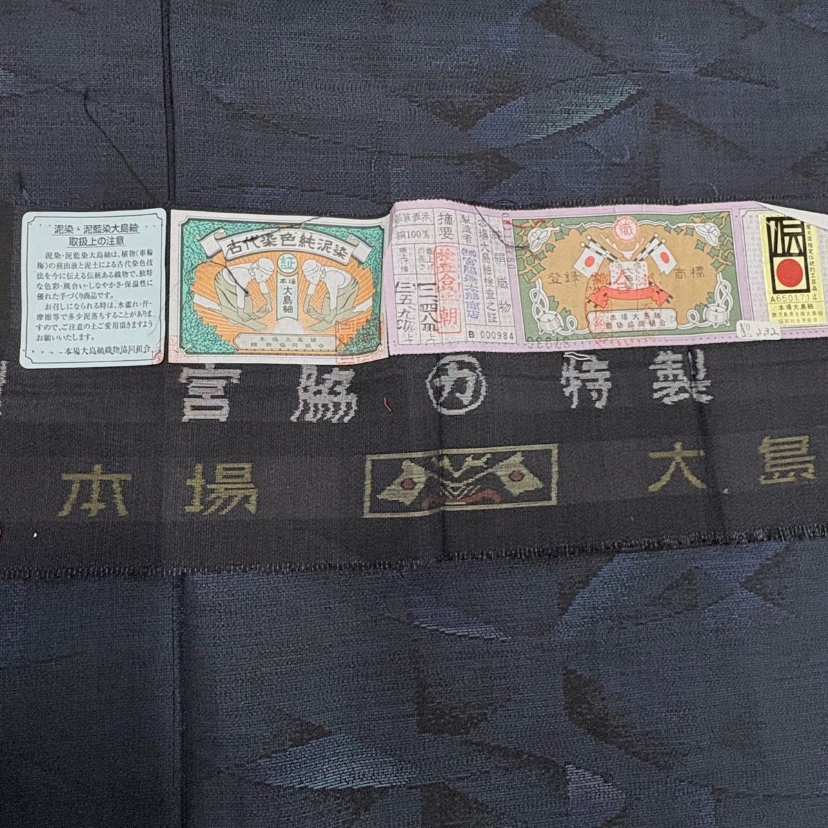 大島紬 身丈164.5 cm 裄丈68 L 袷 純泥染 証紙 幾何学 藍色 正絹