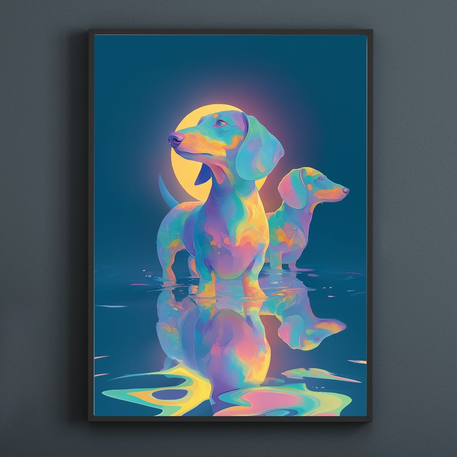 ダックスフンド犬がオーロラのような光に包まれて、幻想的な色彩が空間にやさしく溶け込み、見るたびに癒しを与えてくれるアートポスター作品です。