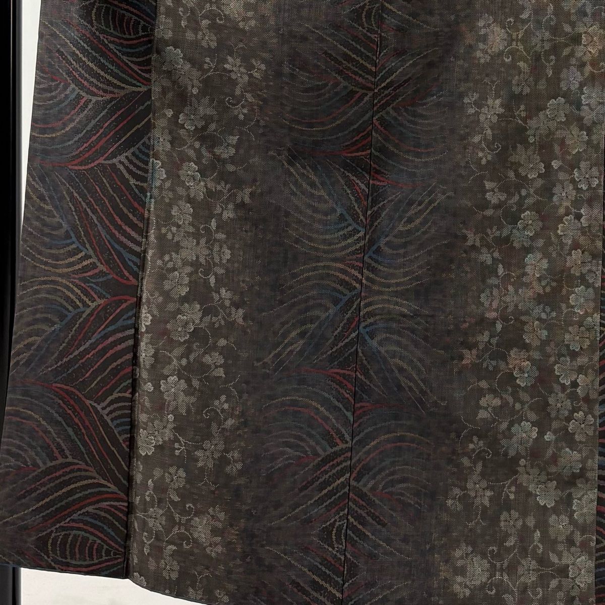 紬 身丈154 cm 裄丈61.5 S 袷 花唐草 波 墨色 正絹 秀品