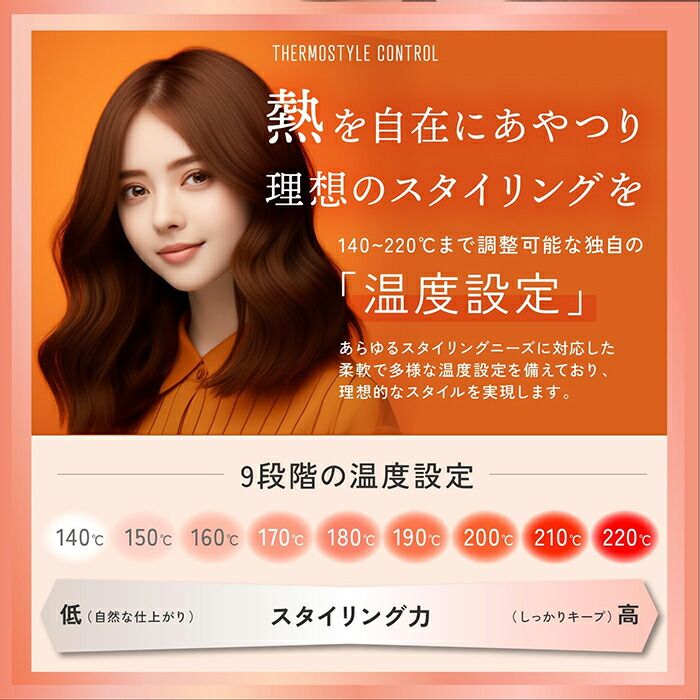 電源:110-240V 50/60Hz 消費電力:49W 温度:9段階140~220℃ プレートサイズ:幅25mm/長さ90mm コード長:1.8m(360度回転) 重量:本体385g(コード含む) メーカー1年保証付き