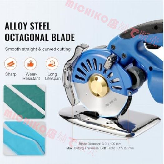 この電動布地カッターは、耐久性のある合金鋼で作られた 3.9 インチ / 100mm の大きな八角形の刃を備えており、切れ味と耐摩耗性を保証します。曲線状のカットでも刃が割れることなく、最大 1.1 インチ / 27mm の柔軟な布地を切断できます。
