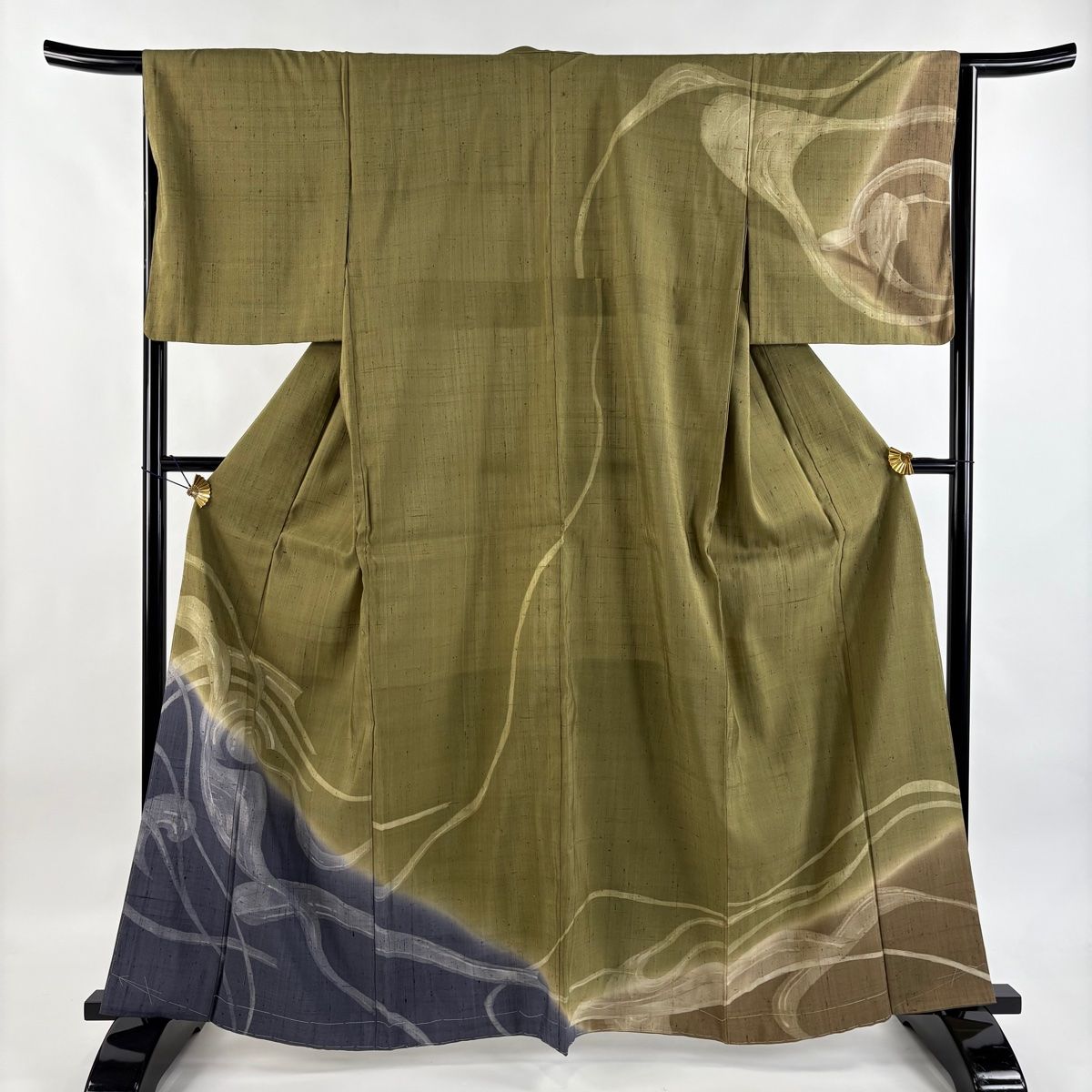 訪問着 身丈162.5 cm 裄丈65 M 袷 紬地 幾何学模様 染め分け 鶯色 正絹