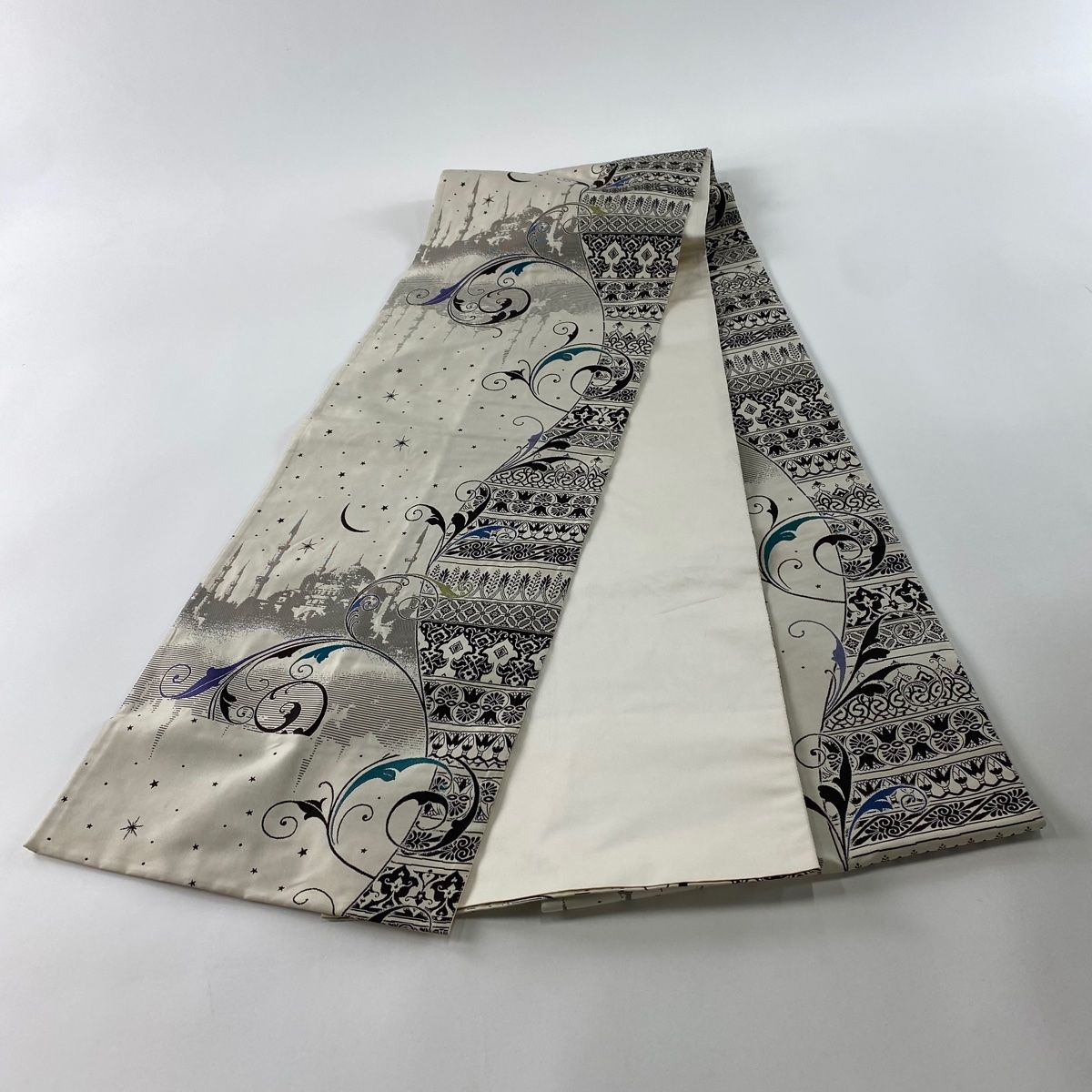 袋名古屋帯 建物 唐草 クリーム 正絹