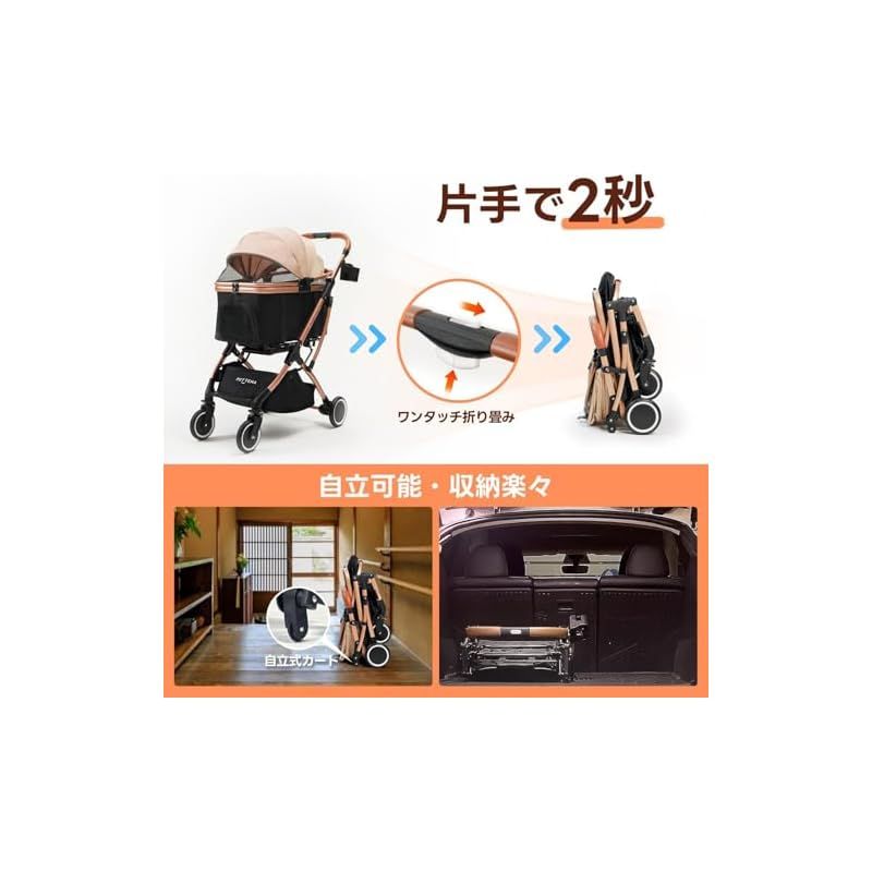 ??【ワンタッチ収納&自立可能、使用便利】従来のペットカートは収納する時、お先にキャリー部分を取り外しする必要があり、収納するのは面倒くさいです。PETTENA猫用ペットカートはお客様の改善意見に基づいて、収納の手順を簡易化します。キャリーを外す必要がなく、ワンタッチで2秒だけ折り畳みが可能、収納するのは速くて簡単になります。もっとも重要な機能はカート自体が折り畳んだ時に自立でき、玄関先や物置でも保管しやすく便利、場所を取らず収納できます。開くときも片手でパッと引き上げるだけの簡単仕様です。車載の場合はベルトガイド付き、座席にしっかり固定できます。PETTENAペットカートで愛犬愛猫とのお出かけをもっと便利に、楽しくなります。