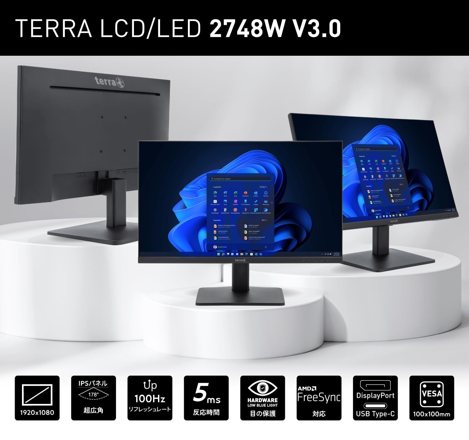 TERRA 2748W 27インチ モニター 最長 5年 IPS 非光沢 フルHD 100Hz HDMI/DisplayPort/USB Type-C (※充電非対応) ハードウェアブルーライトカット スピーカー内蔵 ヘッドホン端子 傾き調整(高さ調整なし)