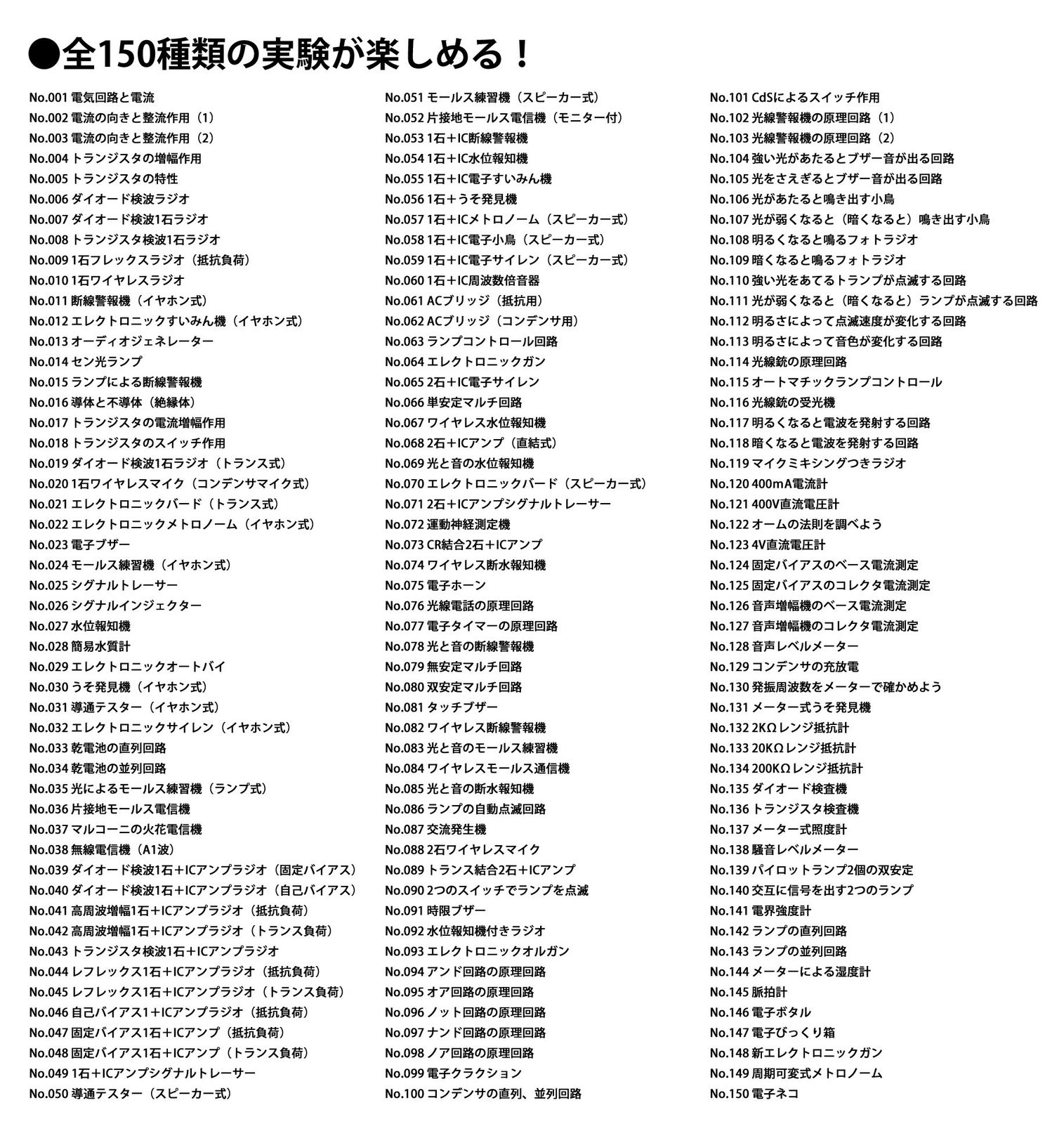 対象性別:男女共用対象年齢:10歳からトランジスタや抵抗を組み込んだ46のブロックを組み合わせて、ワイヤレスマイクや警報機、電子ブザー、うそ発見器など、150種類の電気実験が可能特別な道具は不要で、だれでも簡単に実験を開始できる自身で組み合わせて実験することによって、電子回路の基礎が学べる