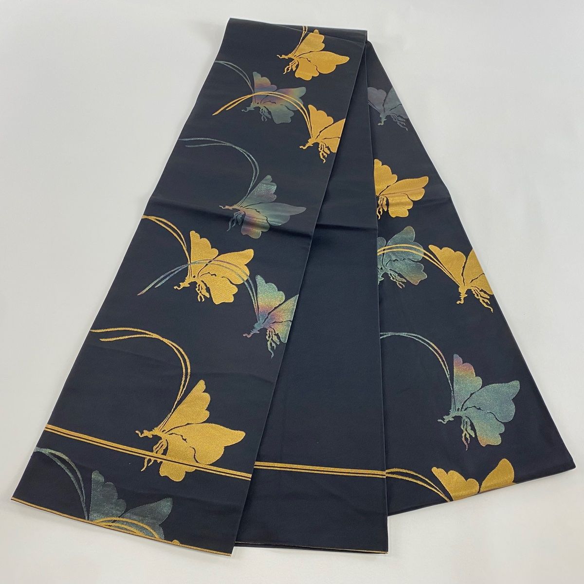 袋帯 秀品 織悦 落款 振袖向き 関西仕立て 蝶 箔 黒 全通 正絹