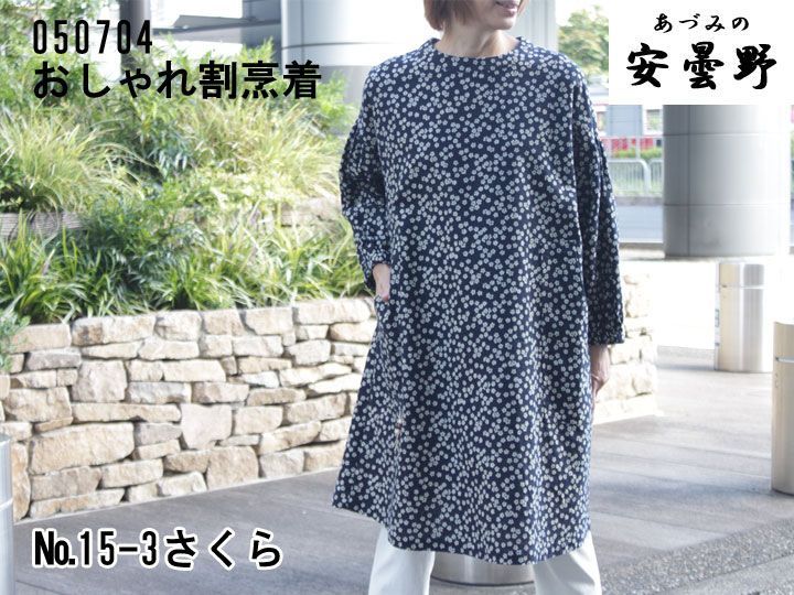 051204 15 3さくら 安曇野 F ゆったり 婦人服 大きい 11号~13号相当 藍染め風 和柄 おしゃれ割烹着 久留米絣パッチワーク ホームウエア