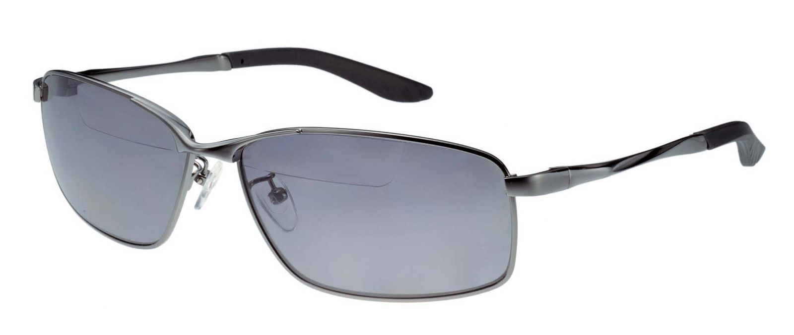 スタンダードメタルデザイン。境目が目立たない老眼鏡入りの偏光サングラスモデル。老眼鏡部分がレンズの上部にセットされている。