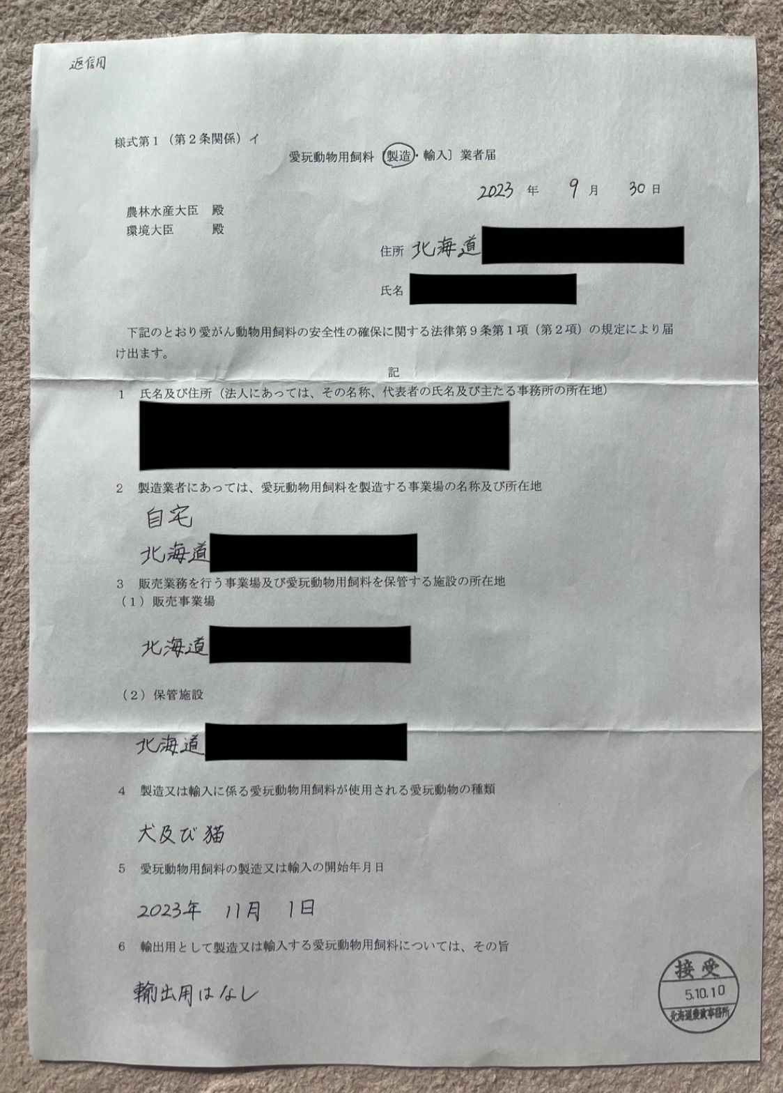 ☀︎ 愛玩動物用飼料製造業者届 北海道農政事務所 接受