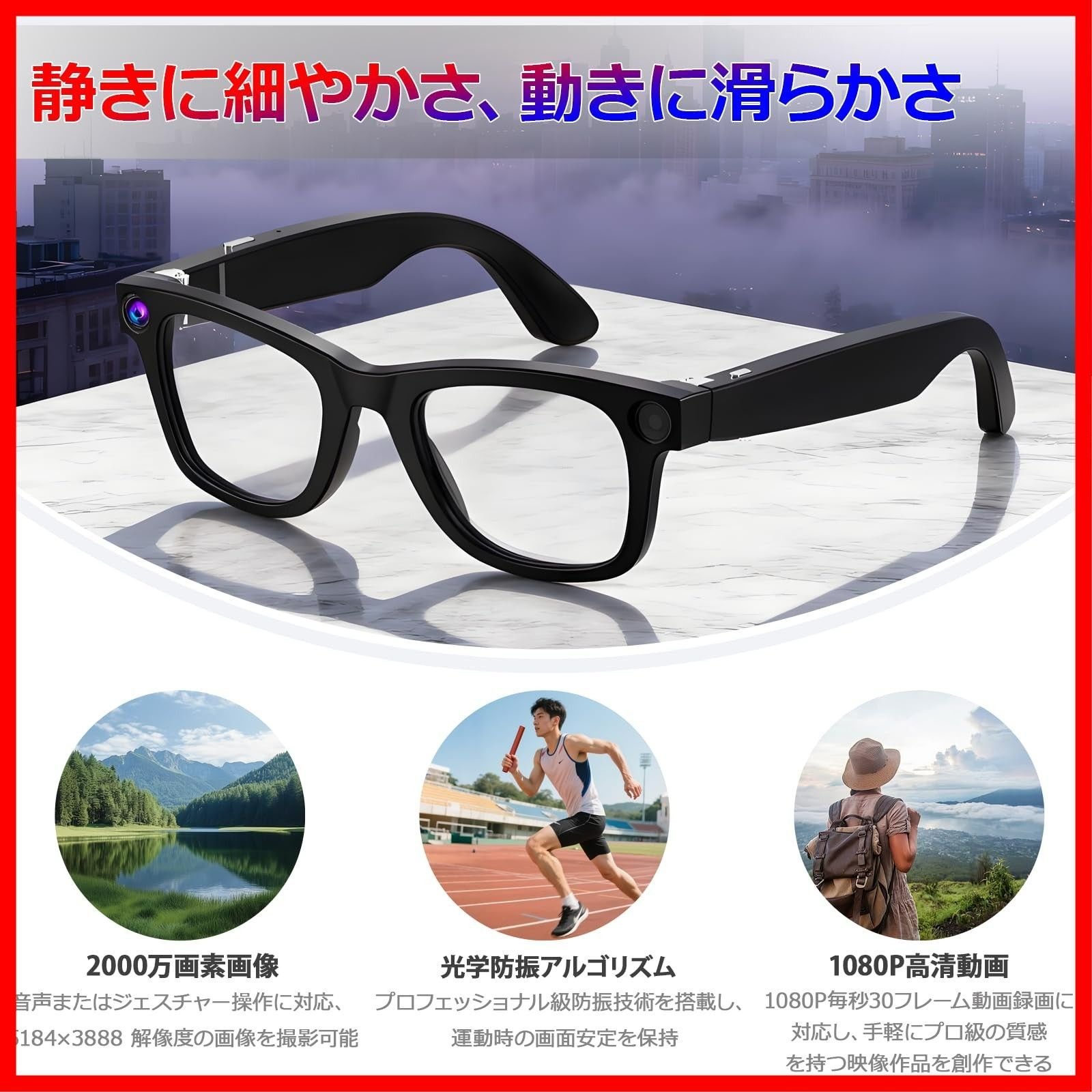 【800 万画素カメラ 高清映像記録】G300S スマートグラスは 800 万画素カメラを搭載し、3000万画素画像(画像解像度 6090×5058)。1080P 30fps の高清動画撮影に対応すると同時に、ソフトウェア防振アルゴリズムにより画面のブレを効果的に抑制し、運動中でもオートフォーカスで鮮明な映像を捕捉できます。また、ジェスチャーまたは音声で録画を迅速に起動でき、操作性がより簡便です。 さらに、G300S オーディオグラスはデュアルシリコンマイクのノイズキャンセリングマイクを搭載し、鮮明な音声を録画できるとともに、リアルな音質を再現します。また、Wi-Fi 伝送機能を利用し、撮影した動画 / 写真をスマホに迅速に同期でき、後の共有や編集に便利です。