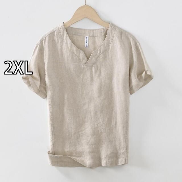 2 XL メンズ ファッション 服 男性用 オシャレ シンプル 大人 かっこいい 大きいサイズ ストリート 紳士服 サマー リネン 半袖 T シャツ トップス Vネック ポロ 綿 レトロ フル