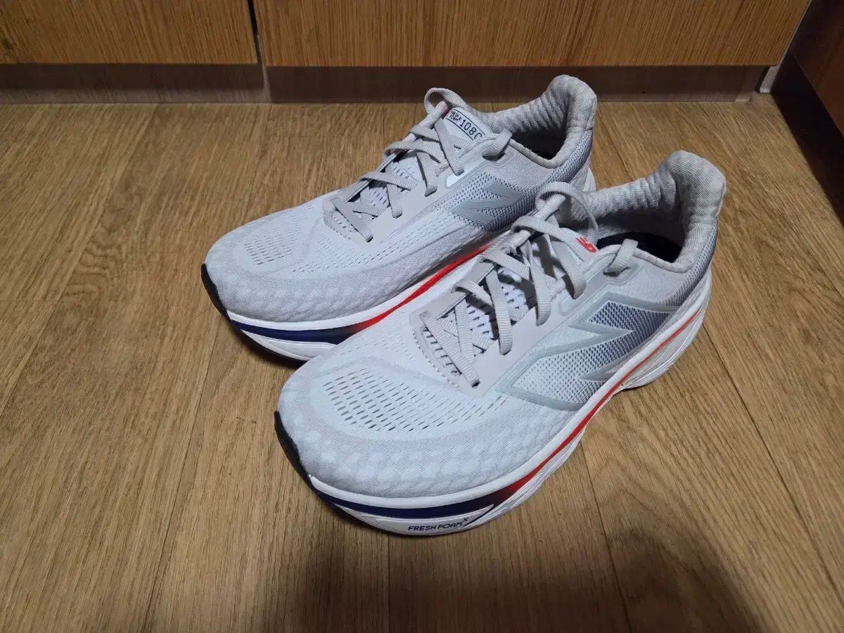 これはニューバランスフレッシュフォーム1080 v14モデルです。ほのかなグレーの色調にNew Balanceのロゴがアクセントになっています。靴底のほんのり見える赤いラインが洗練された印象を醸し出しています。他に質問がない場合は、すぐに安全な支払いを行ってください!