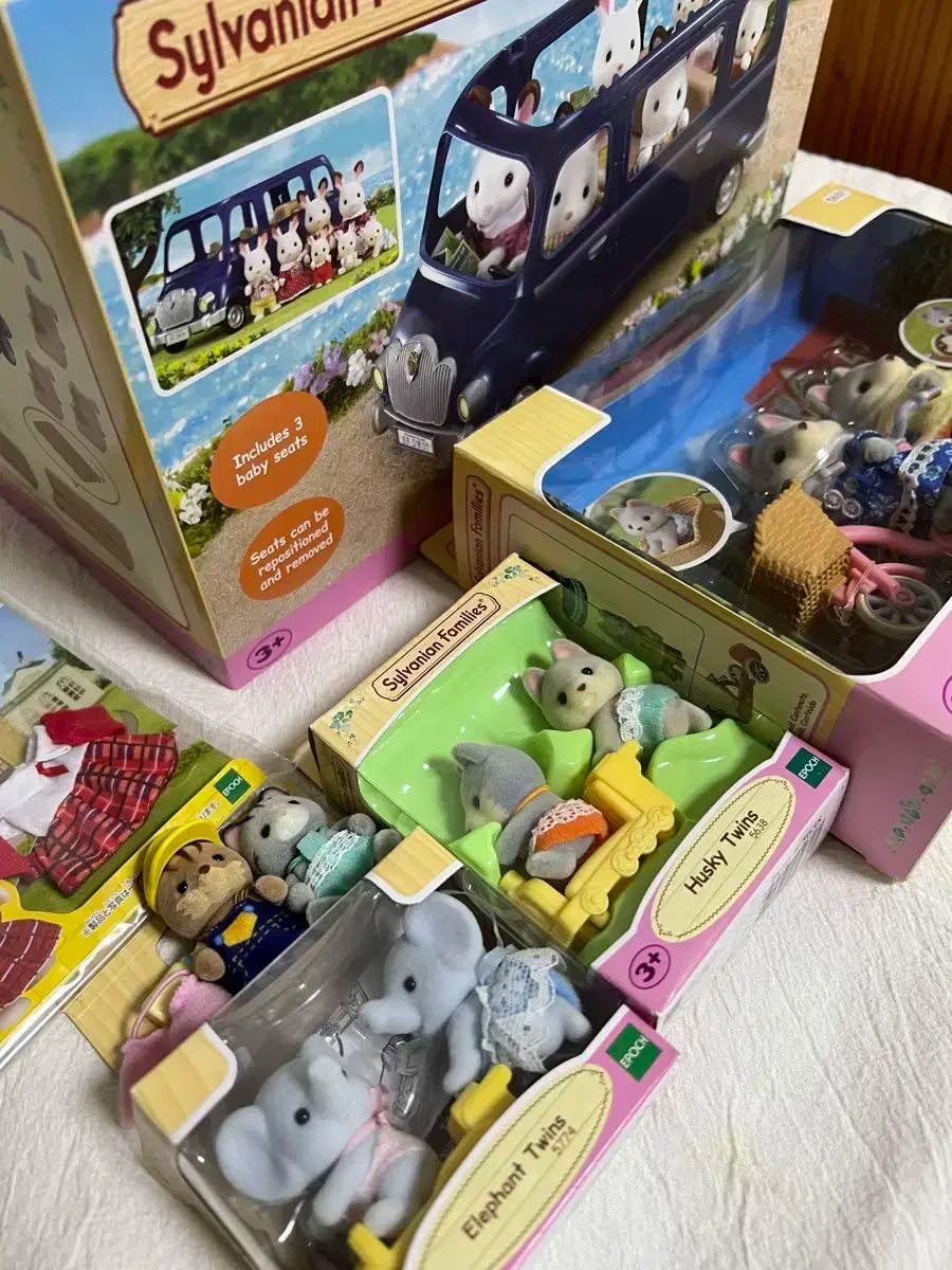 シルバニア車 (未開封)、シルバニア姉妹サイズの服、ハスキー兄弟、エレファントハスキー、リス、子猫、バッグをまとめて販売しています。