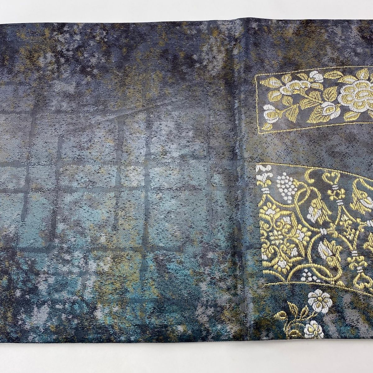 袋帯 秀品 短冊 華文 金糸 箔 青灰色 六通 正絹