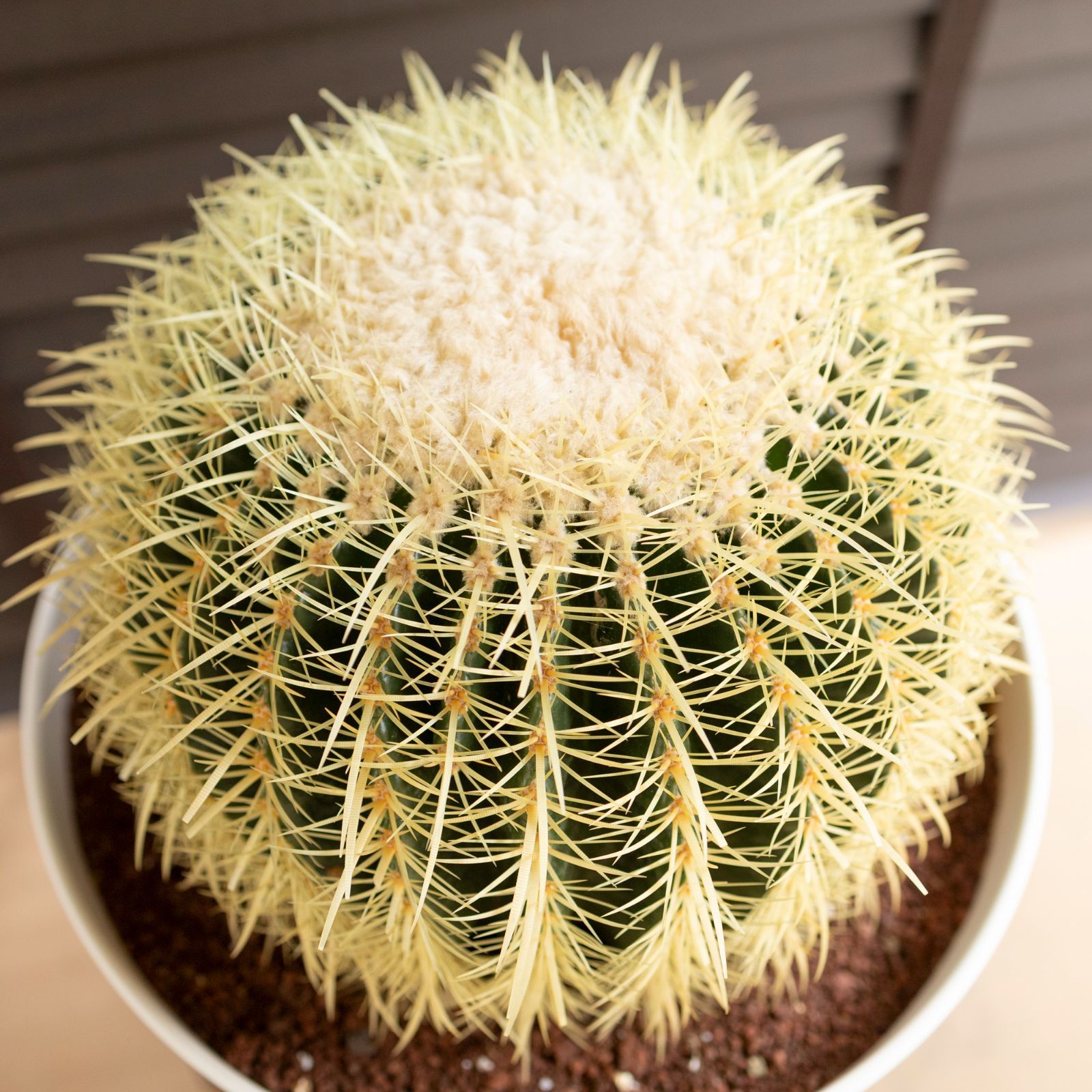 Echinocactus grusoniiという名の品種で黄金色の鋭いトゲで覆われているのが特徴的。