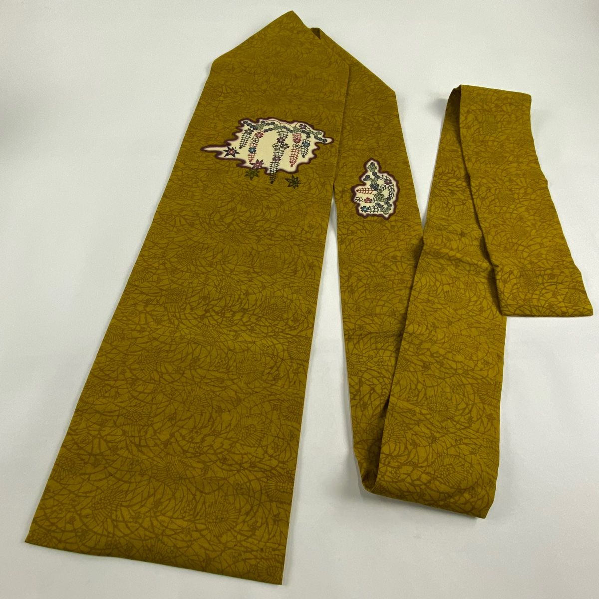 名古屋帯 紬地 花 亀甲 からし色 正絹