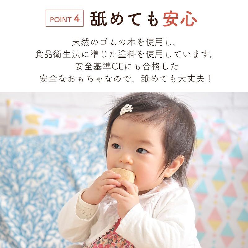 使い方1:木製ビーズ入りの積み木を振って優しい音で赤ちゃんの聴覚を育みます 使い方2:興味をひきやすい鮮やかな色なので視覚を養うのに最適です 使い方3:手先が器用になり、バランス感覚も見につきます 使い方4:想像力を最大限に引き出します