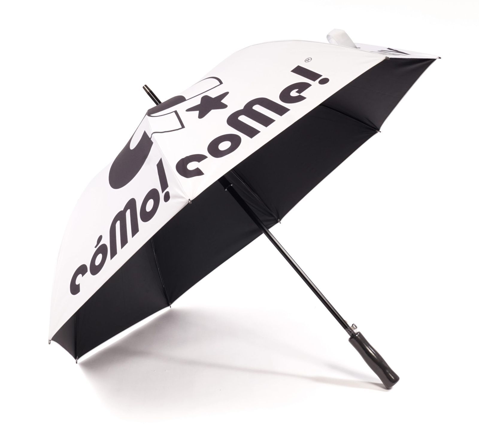 ゴルフアクセサリーブランド「コモコーメ」、ゴルフメンズアパレル「クラッチプレーヤー」、スイング練習器具「ライビースイング」の3ブランドロゴを大胆に配したツアープロ気分が味わえるゴルフ傘。