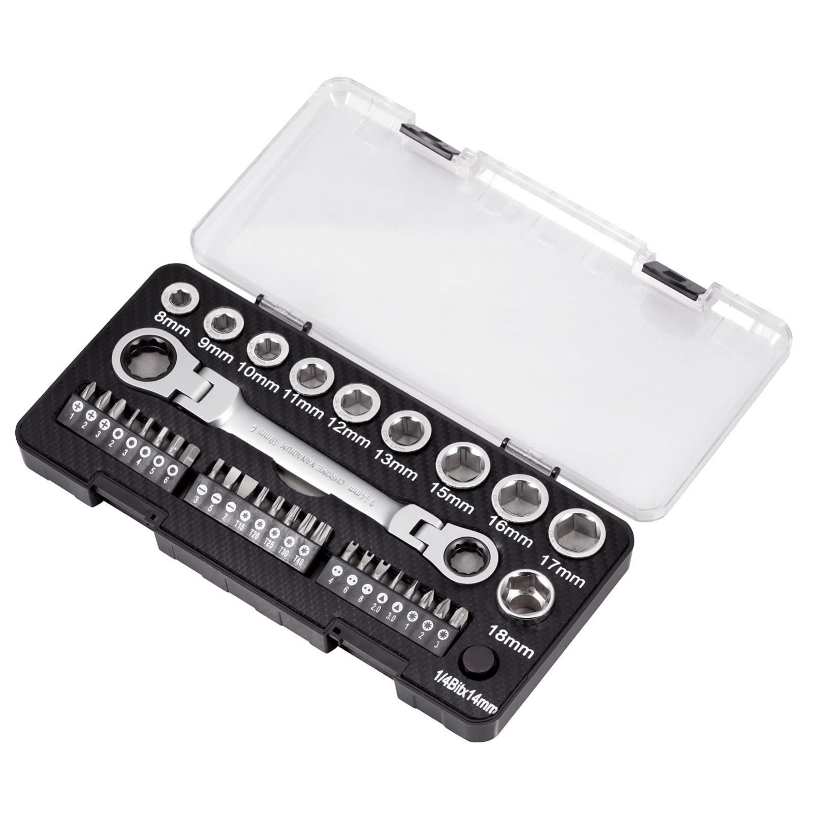 1個のスリーブアダプターロッド; 10 xソケット(8-9-10-11-12-13-15-16-17-18mm); 異なる仕様の24個のビットソケット。